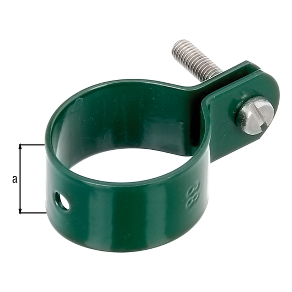 Produktinformationen "Alberts Schelle zur Befestigung von Streben an Pfosten, 21,8 x 41,3 x 65,3 mm, Schellen-Ø: 38 mm, Stahl roh, verzinkt grün kunststoffbeschichtet RAL 6005 - 1 Stk."