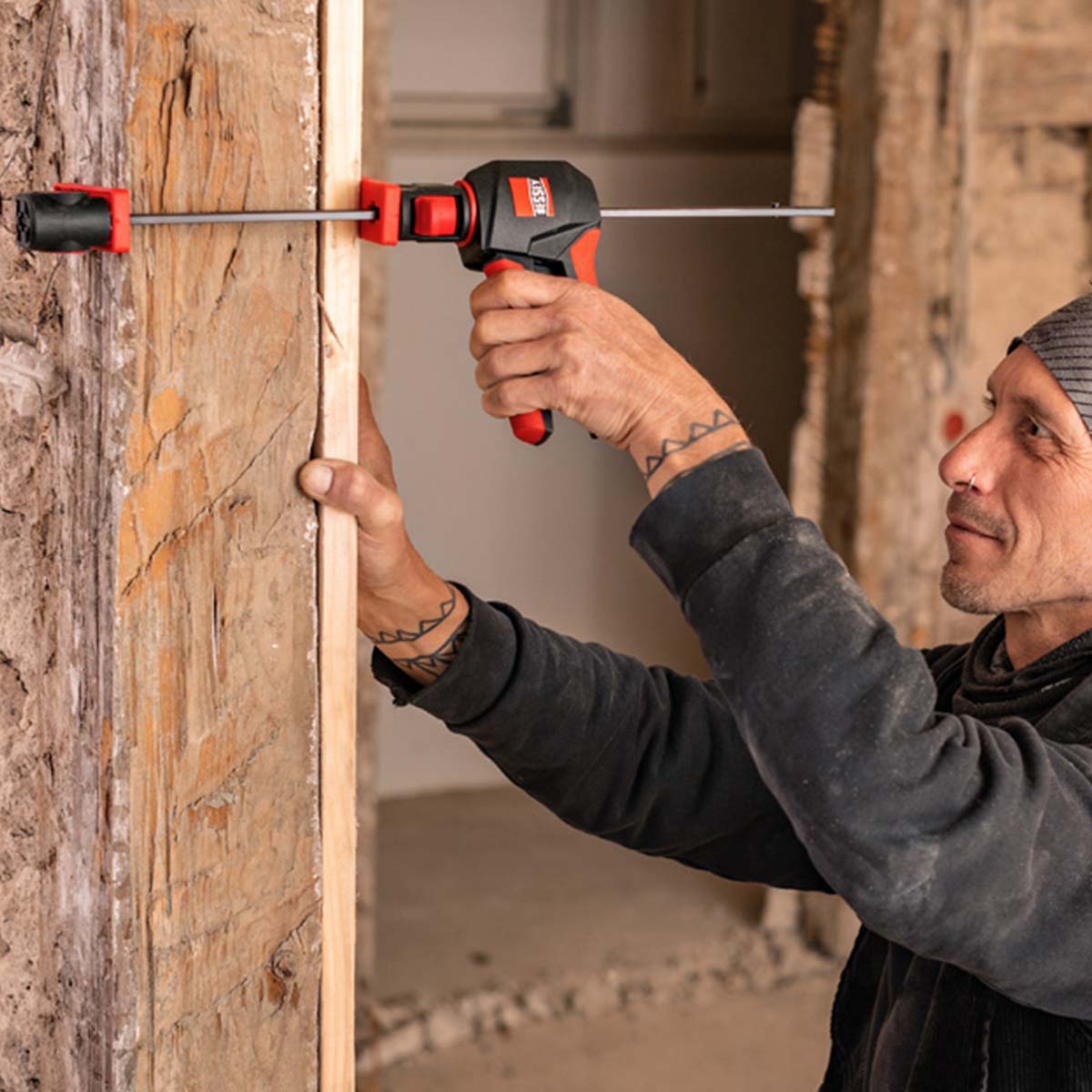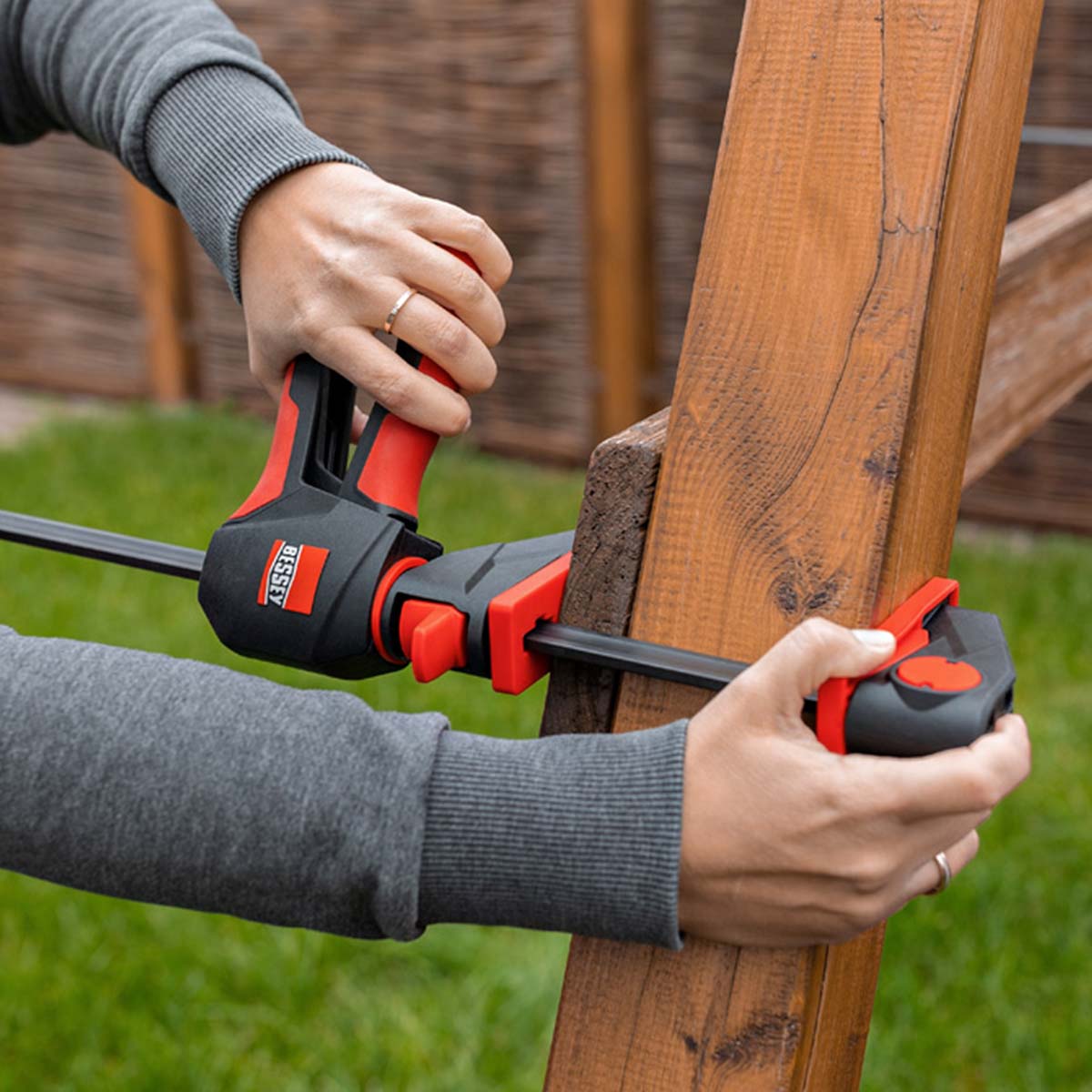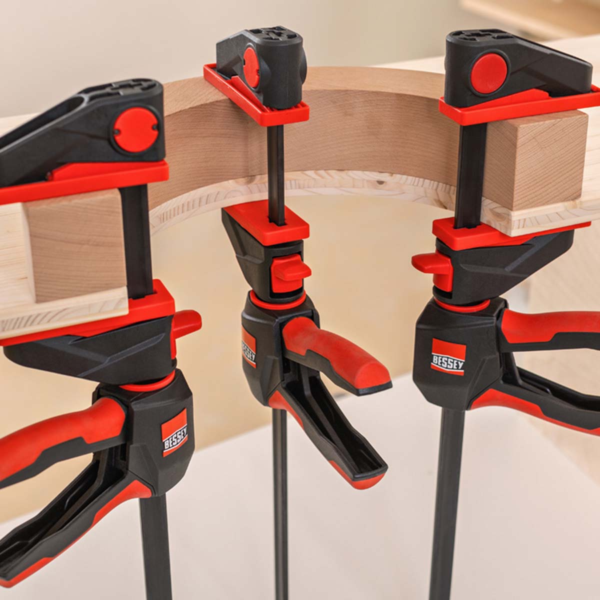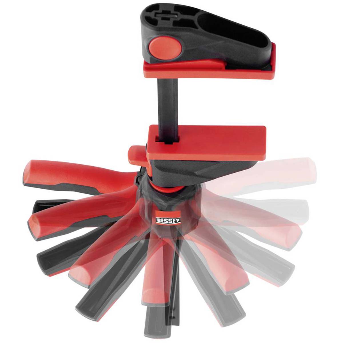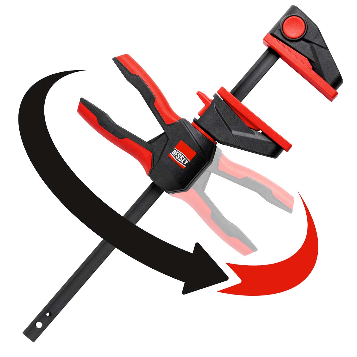 Bessey schafft hier mit dem innovativen 360° Dreh-Mechanismus Abhilfe und ermöglicht das Platzieren der Griffeinheit rund um die Schiene!