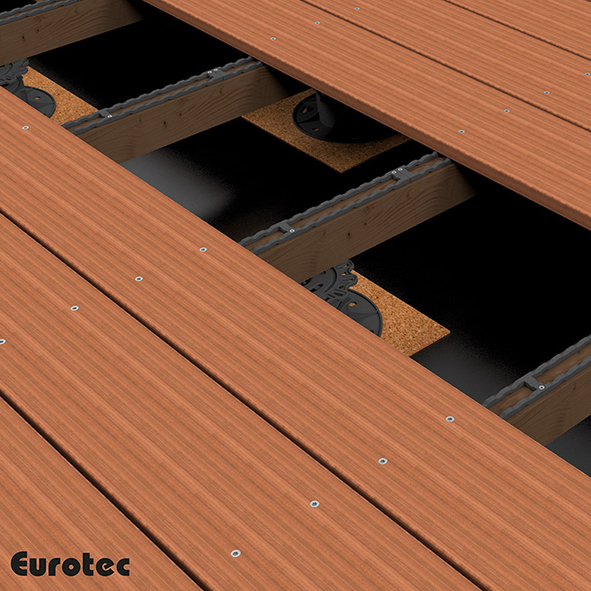 Die Terrassen-Unterkonstruktion aus Holz ist individuell für sichtbare und nicht sichtbare Befestigungen der Terrassendielen geeignet. Für die sichtbare Befestigung von Terrassen kann die Dista-Leiste 2.0 verwendet werden. Sie wirkt als Abstandhalter und dient einem Bewegungsspielraum von 7 mm zwischen Paneel und Unterkonstruktion.