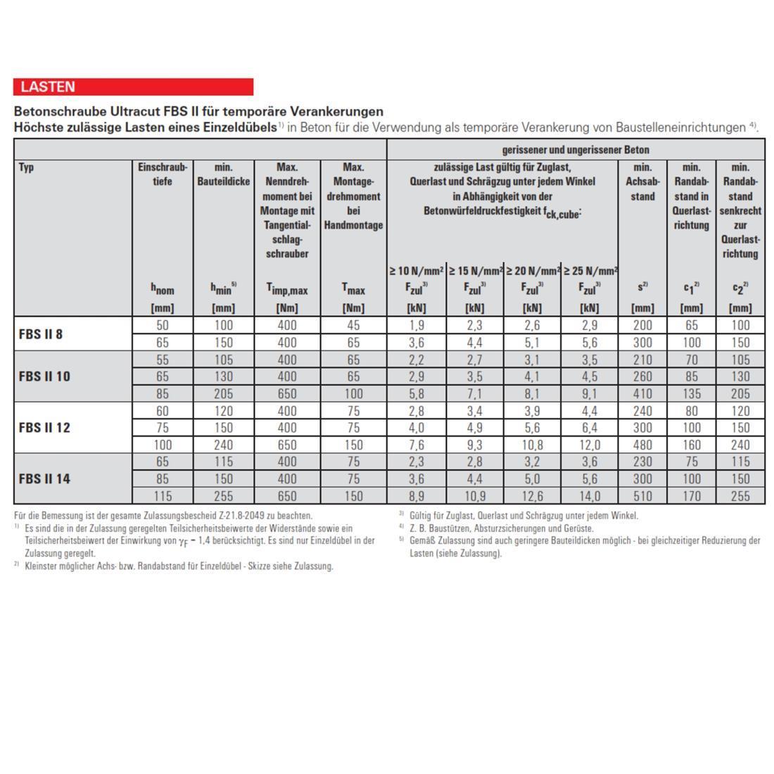 - Die Betonschraube FBS II 6-10 aus galvanisch verzinktem Stahl, mehrfachbeschichtetem Stahl CP und Edelstahl besitzt eine ETA für die Steine Mauerziegel Mz (EN771-1), Kalksandsvolsltein KS (EN771-2) und Kalksandlochstein KSL (EN771-2) für den flexiblen Einsatz in unterschiedlichen Untergründen.