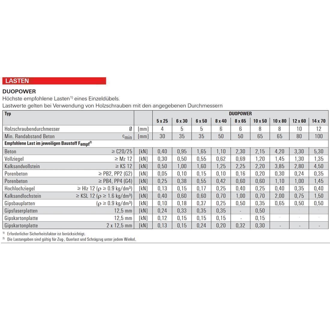 Der fischer DUOPOWER bietet sehr gute Haltewerte durch 2 Komponenten: Die graue Komponente aus hochwertigem Nylon aktiviert je nach Baustoff automatisch das optimale Funktionsprinzip (Spreizen, Klappen, Knoten) für besten Halt. Die Expansionsflügel der roten Komponente unterstützen die sichere Verspreizung und bieten zusätzliche Sicherheit zur grauen Komponente. Einfaches Eindrehen der Schraube und richtiges „Ziehen“ zum Schluss. Kein Überdrehen der Schraube. Der am Dübelkopf angeformten Rand verhindert, dass der Dübel ins Bohrloch rutscht.