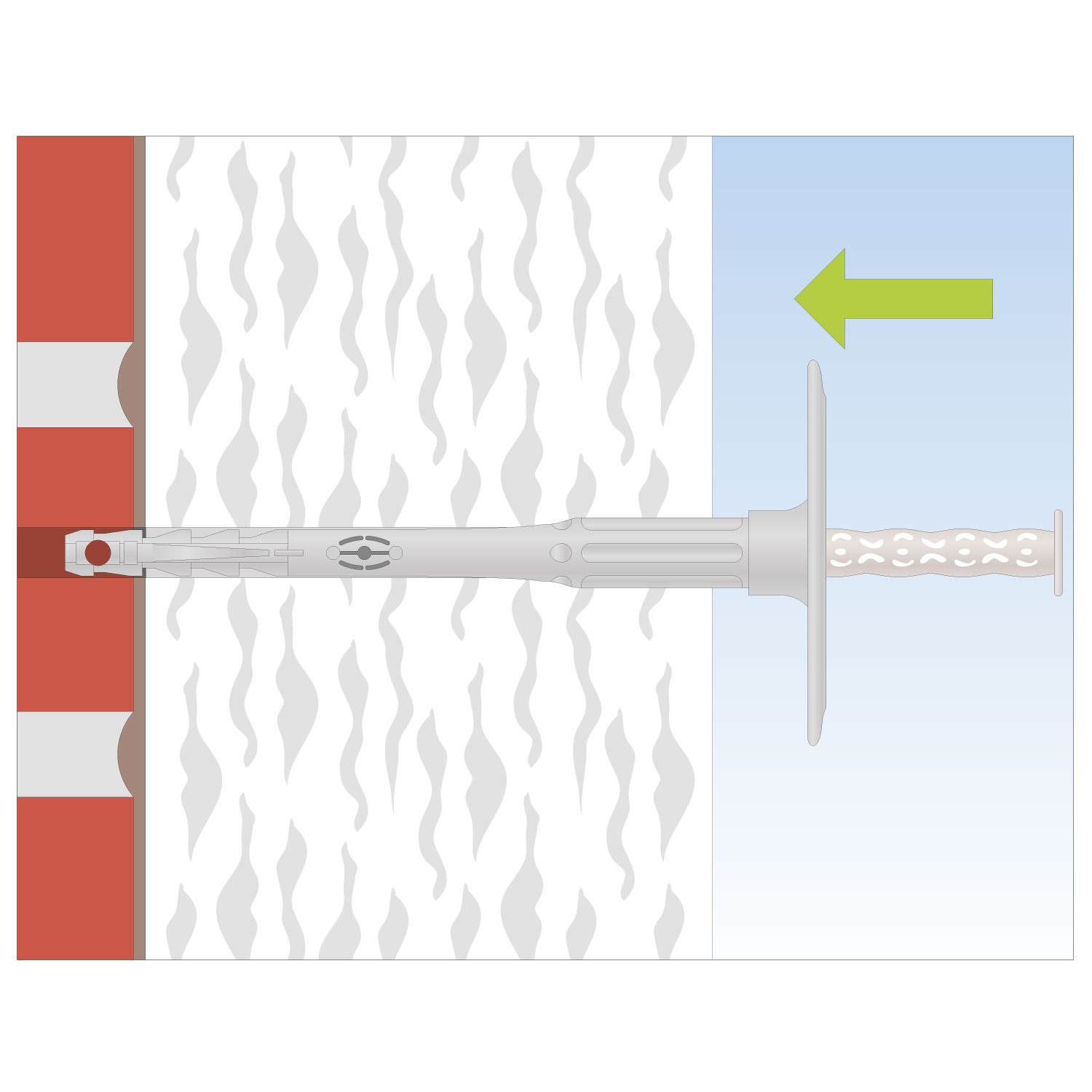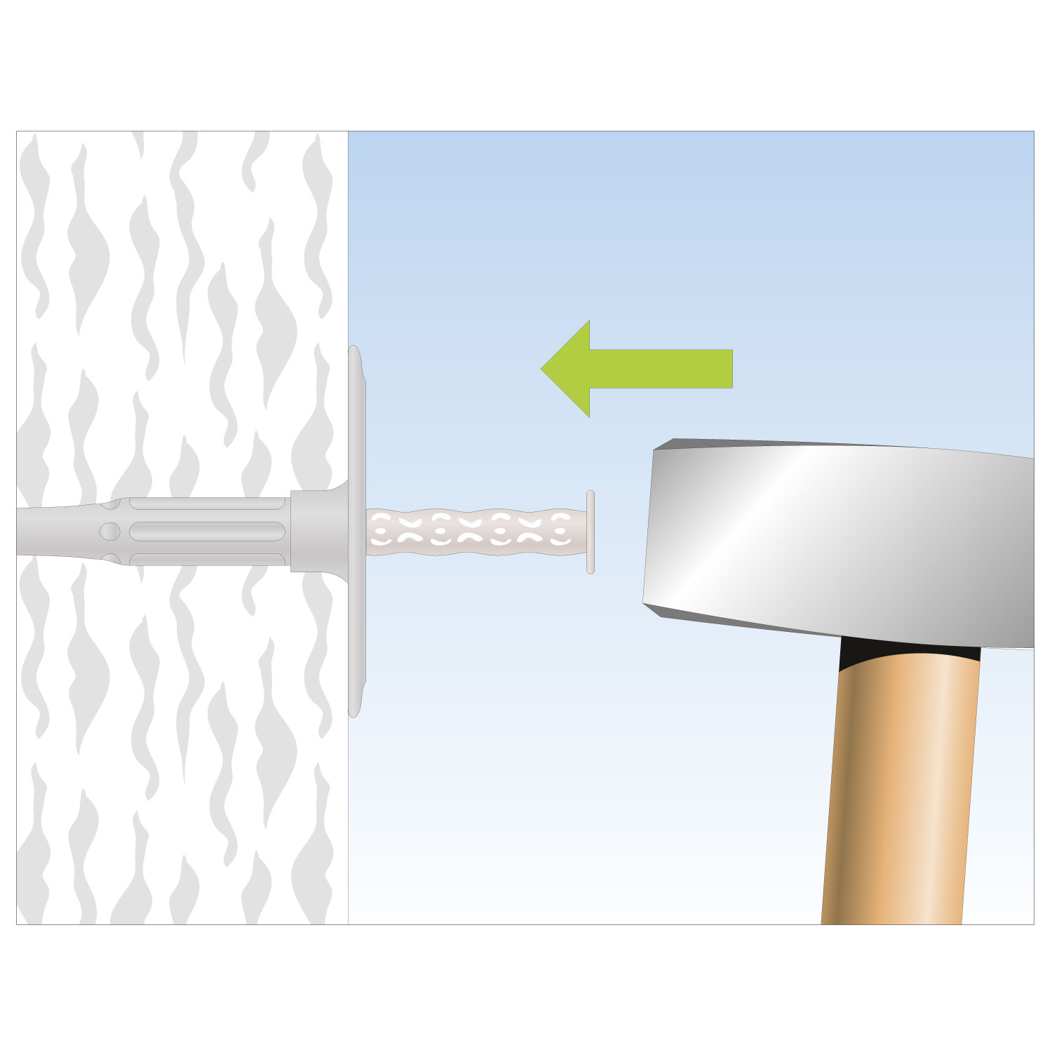 Der FIF-PN wird mit dem Hammer eingeschlagen. Das spart Zeit und Kosten. Die integrierte Einschlagsperre vermeidet das vorzeitige Aufspreizen und ermöglicht eine störungsfreie Montage. Der glasfaserverstärkte Kunststoff-Nagel reduziert die Transmissionswärme und verhindert Abzeichnungen an der Putzoberfläche.