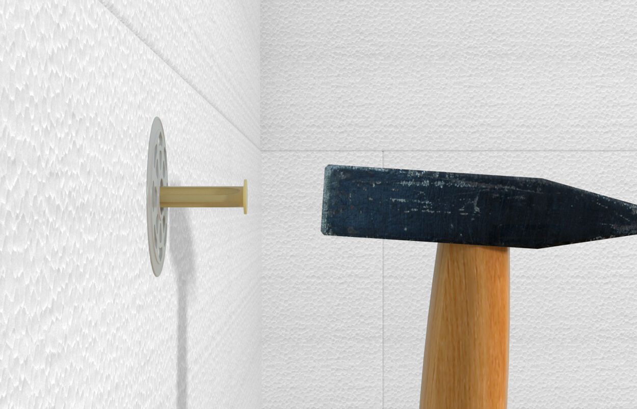 Der FIF-PN wird mit dem Hammer eingeschlagen. Das spart Zeit und Kosten. Die integrierte Einschlagsperre vermeidet das vorzeitige Aufspreizen und ermöglicht eine störungsfreie Montage. Der glasfaserverstärkte Kunststoff-Nagel reduziert die Transmissionswärme und verhindert Abzeichnungen an der Putzoberfläche.