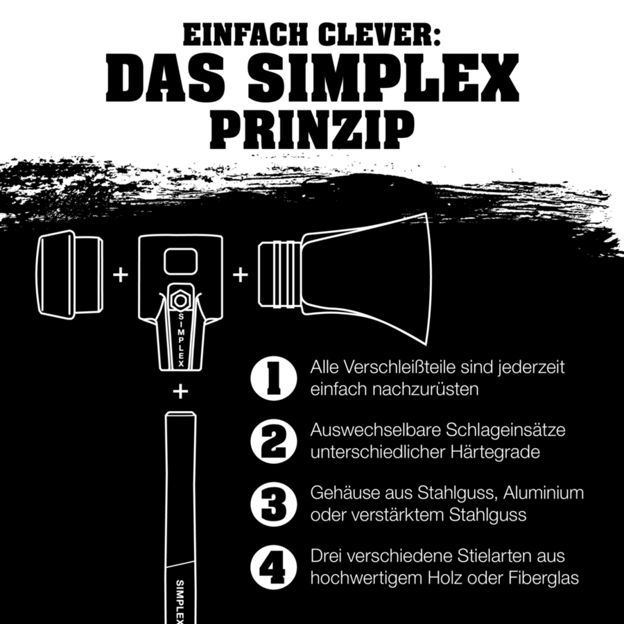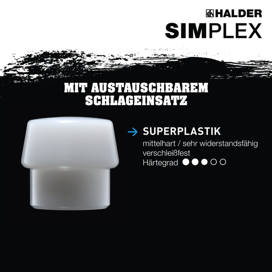 - Keine Verletzungsgefahr bei Keilarbeiten durch Metallsplitter aufgrund des Superplastik-Einsatzes in D60mm (weiß, mittelhart, sehr widerstandsfähig).