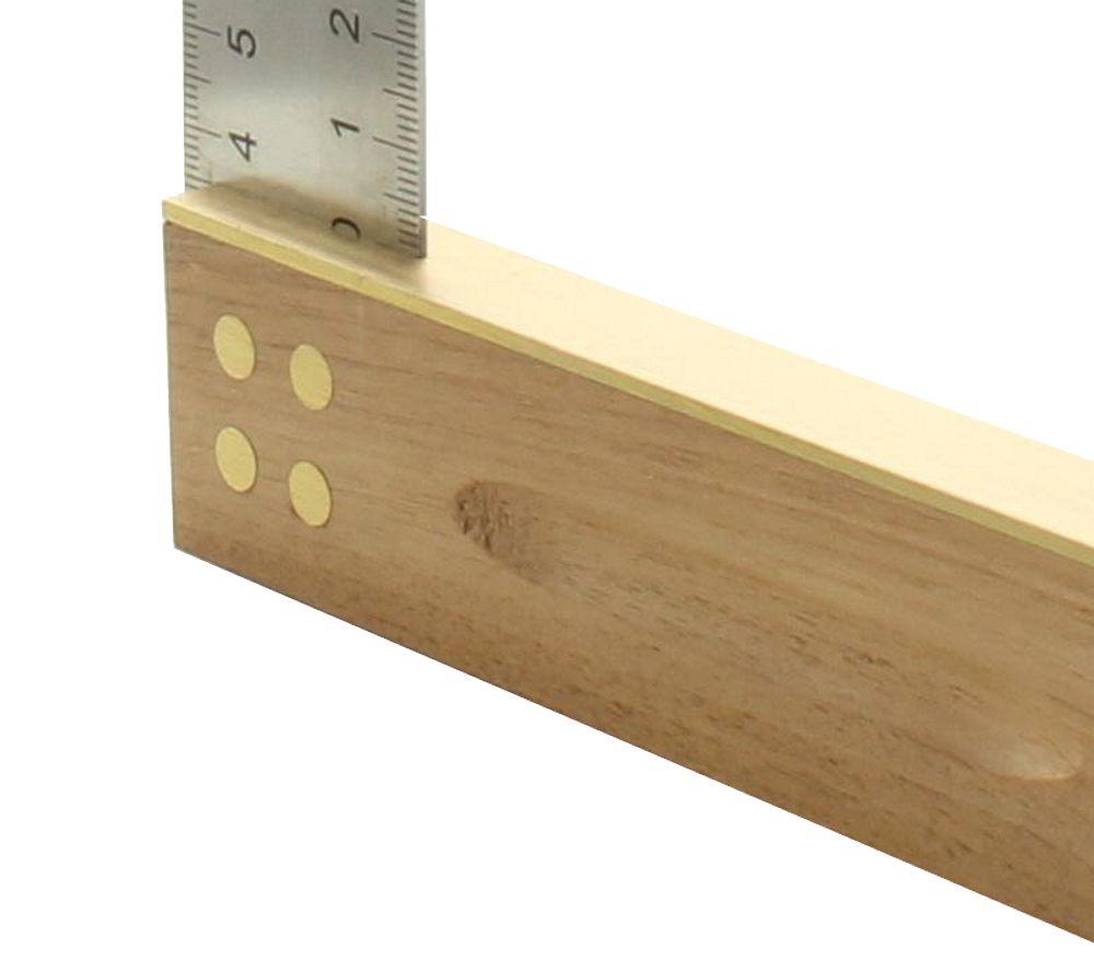 Der Schenkel ist aus hochwertigem Nussbaumholz gefertigt und mit einem Messingprofil am Innenschenkel beschlagen. Durch die beidseitige Griffhohlkehle liegt der Winkel stets gut in der Hand.
