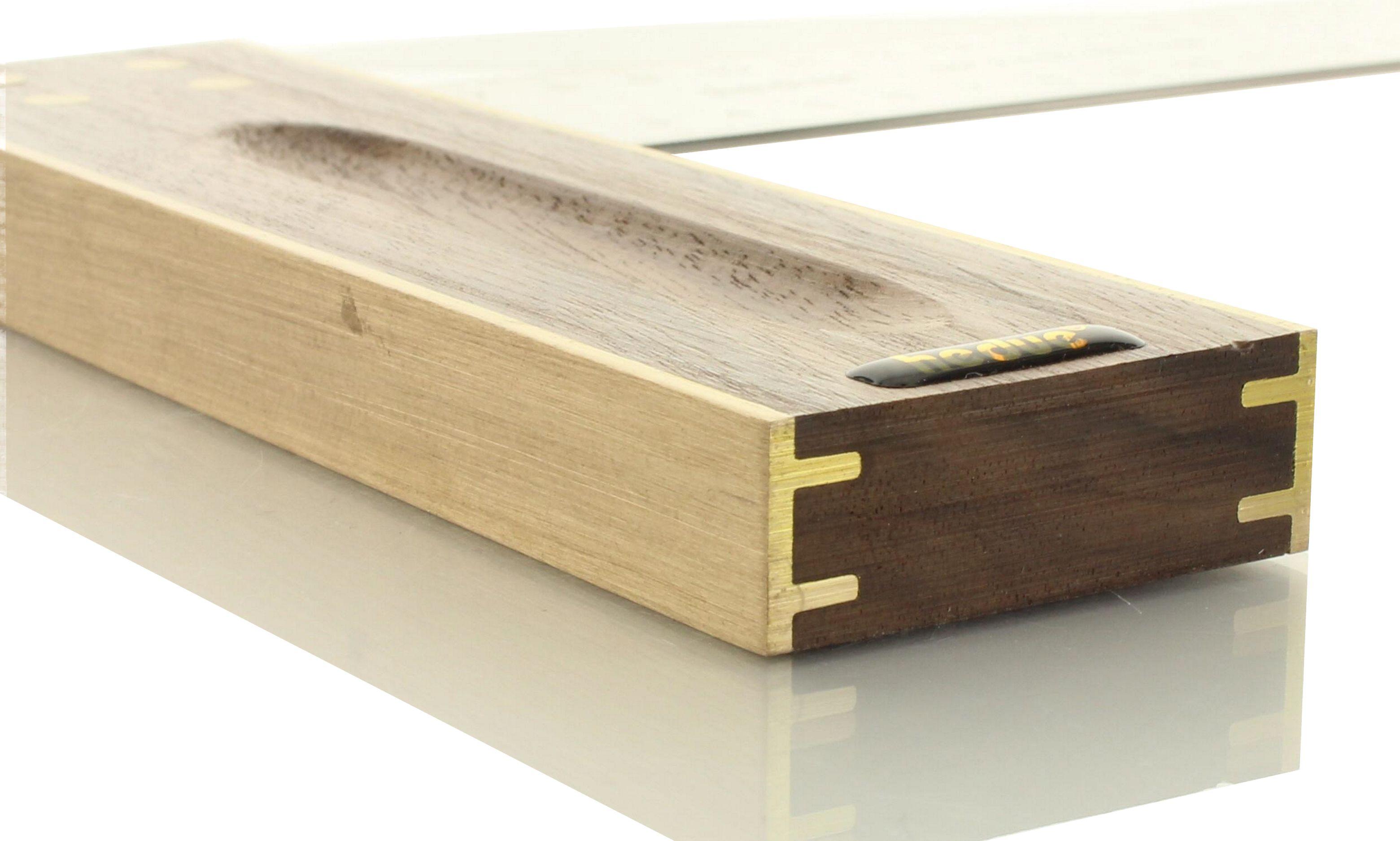 Der Schenkel ist aus hochwertigem Nussbaumholz gefertigt und mit einem Messingprofil am Innenschenkel beschlagen. Durch die beidseitige Griffhohlkehle liegt der Winkel stets gut in der Hand.
