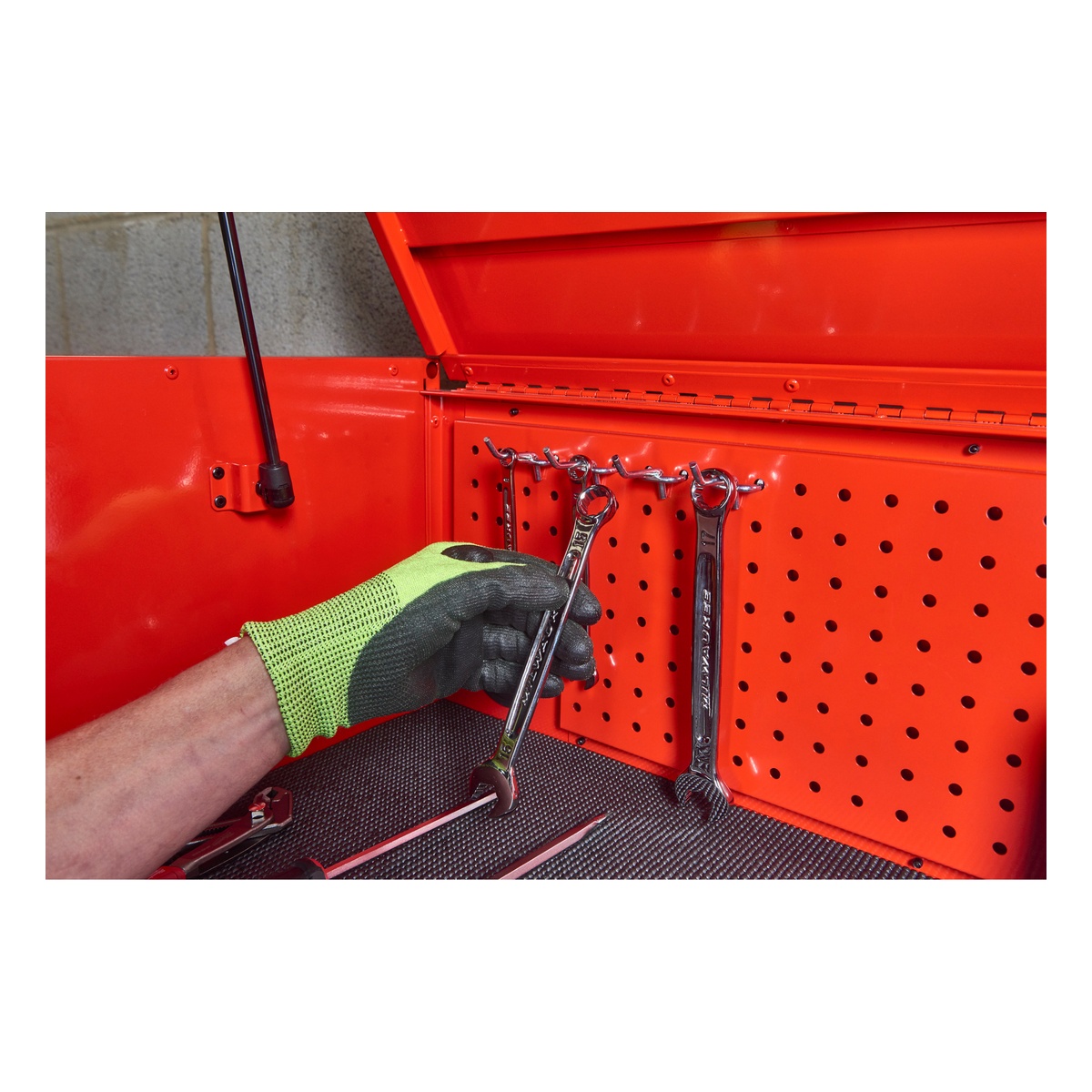 - Zwei Aufbewahrungsschalen, die umgedreht werden können, um eine bündige Oberfläche zu schaffen, oder komplett entfernt werden können, um lange Werkzeuge vertikal zu lagern