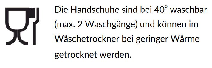 Die Handschuhe sind bei 40 Grad waschbar (max. 2 Waschgänge) und können im Wäschetrockner bei geringer Wärme getrocknet werden.