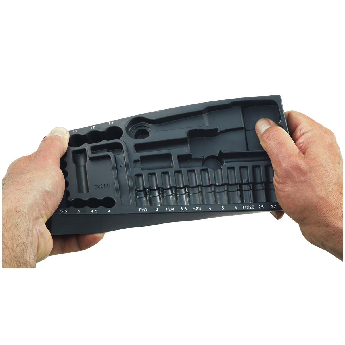 Werte für Härte und maximales Drehmoment sind besser als von DIN/ISO gefordert. Die Maßhaltigkeit liegt innerhalb der zugelassenen Toleranzen. Mit verwindungsfesten, unverwüstlichen Formeinlagen aus gespritztem POLYPROPYLEN. Ölfest, säurefest, und leicht zu reinigen. Mit dauerhaft gut lesbarer Markierung für alle Schlüsselweiten. Sie eignen sich ebenfalls hervorragend zum Einlegen in Schubladen der gängigen Werkstattwagen.