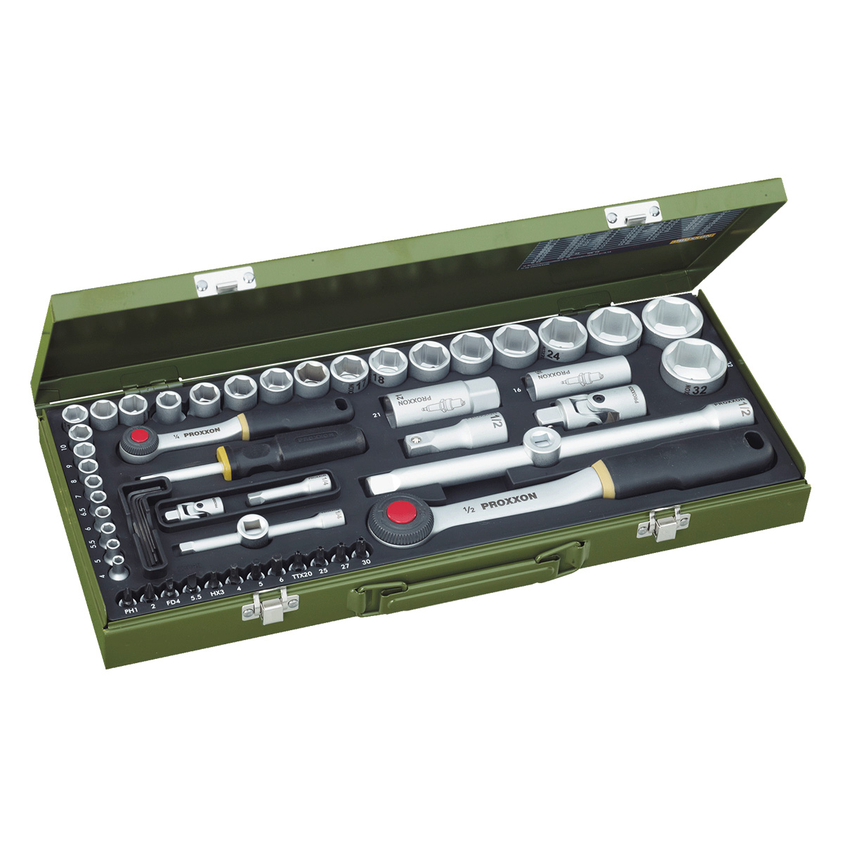 Der Komplett-Steckschlüsselsatz 1/4" + 1/2" von PROXXON kommt im stabilen, pulverbeschichteten Stahlkasten. Mit Steckschlüsseleinsätzen von 4 - 32 mm und Zündkerzenspezialeinsätzen von 16 und 21 mm. Schraubereinsätze mit Vierkantantrieb für Schlitzschrauben, Kreuzschlitzschrauben, TX-Schrauben (mit stirnseitiger Bohrung) und Innensechskantschrauben sowie Innensechskantschlüssel (abgewinkelt) Größe 1,25 - 1,5 - 2 - 2,5 und 3 mm sind ebenfalls enthalten. Eine Tabelle für Gewinde von M 1,6 - M 24 mit Anzugsdrehmomenten ist im Deckel dauerhaft fixiert.