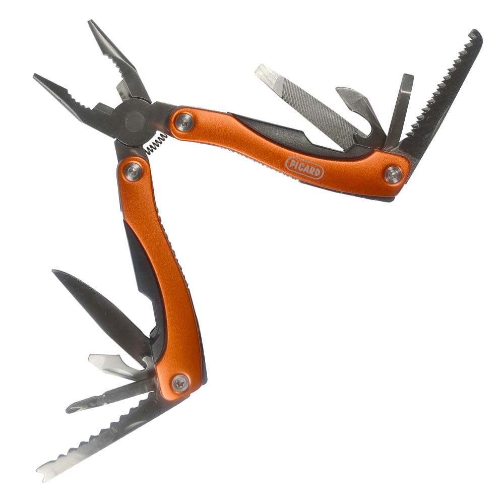 in Tasche. Funktionen: Standardzange, Drahtschneider, Säge, Dosenöffner, Messer, Fischentschupper, Hakenlöser, Flaschenöffner, kleiner Schraubendreher, Kreuzschlitz- Schraubendreher und Feile mit Schraubendreher