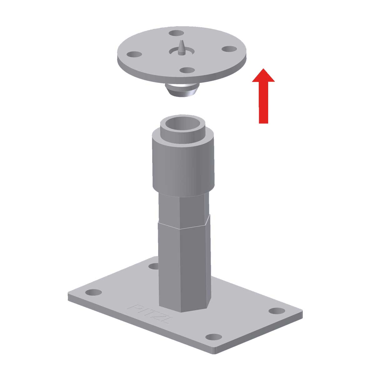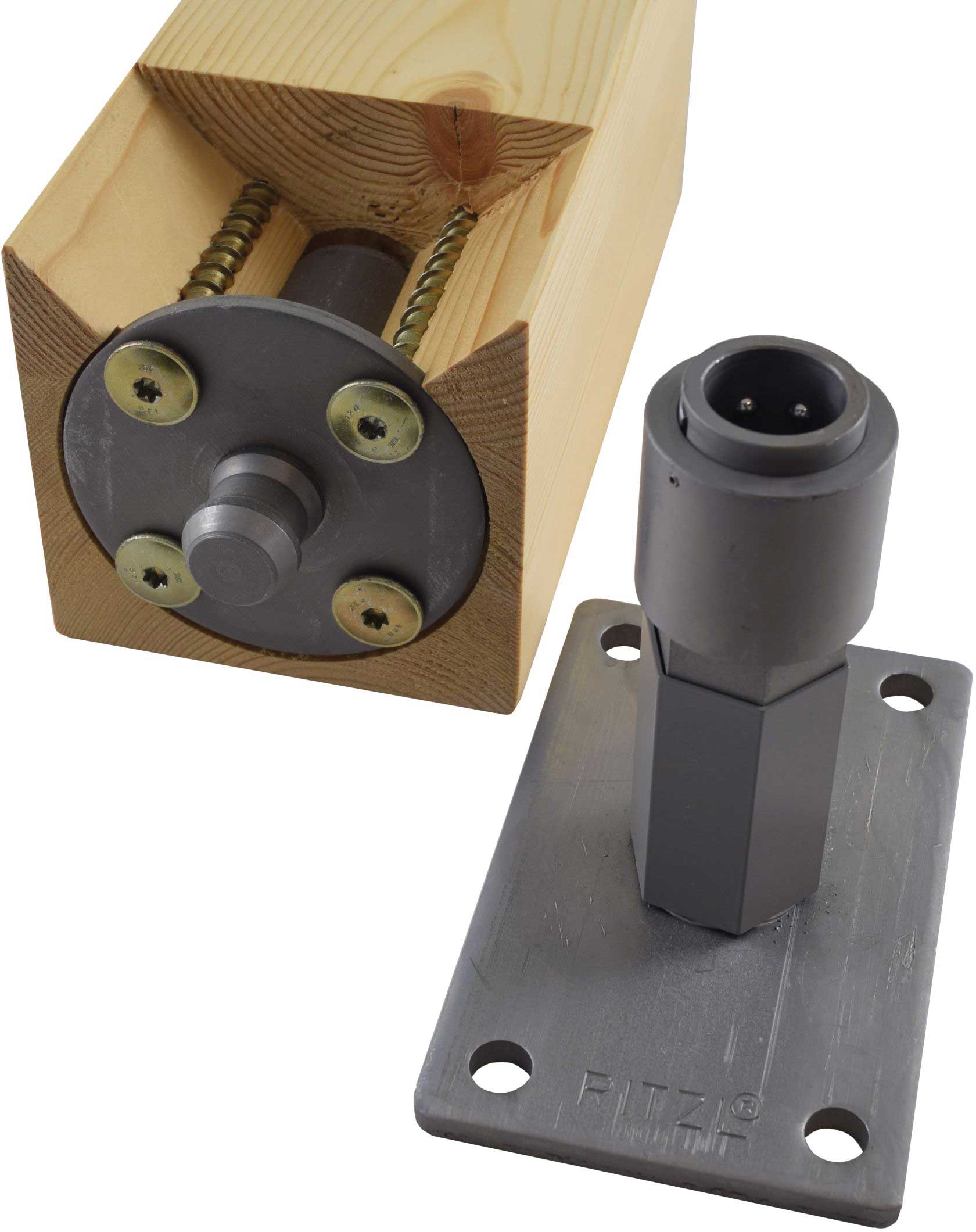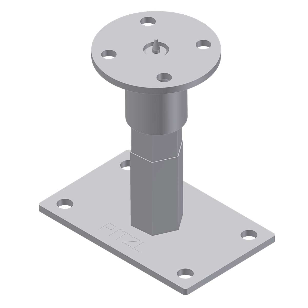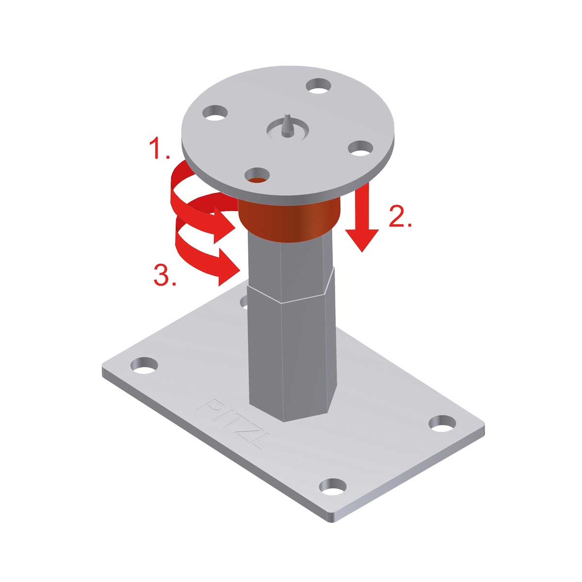 Mit wenigen Handgriffen, ohne zeitaufwendige und umständliche Verschraubungen, ermöglicht das neue Stecksystem eine effi iziente Montagelösung. Maximale Lastaufnahmen bei Druck, Zug und horizontalen Lasteinwirkungen werden durch die optimale Materialstärkenabstimmung des Pfostenträgers garantiert. Eine Höhenverstellung ist auch in einge- bautem Zustand und unter hoher Lasteinwirkung möglich.