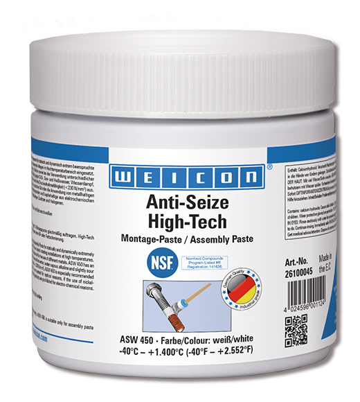Die Montagepaste WEICON Anti Seize High-Tech ist hochtemperaturbeständig, hat eine außergewöhnlich gute Trennwirkung, ist metallfrei, werkstoffneutral und hat eine NSF-Zulassung.
