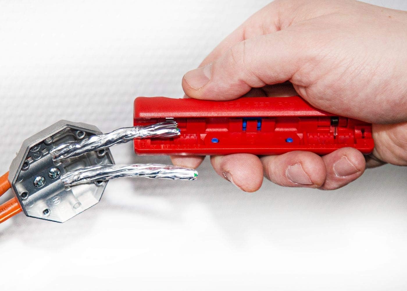 die präzise Klingeneinstellung setzt die Außenisolierung optimal ab. Mit der zweiten Klinge wird die Folienschirmung passgenau angeritzt und kann einfach entfernt werden.